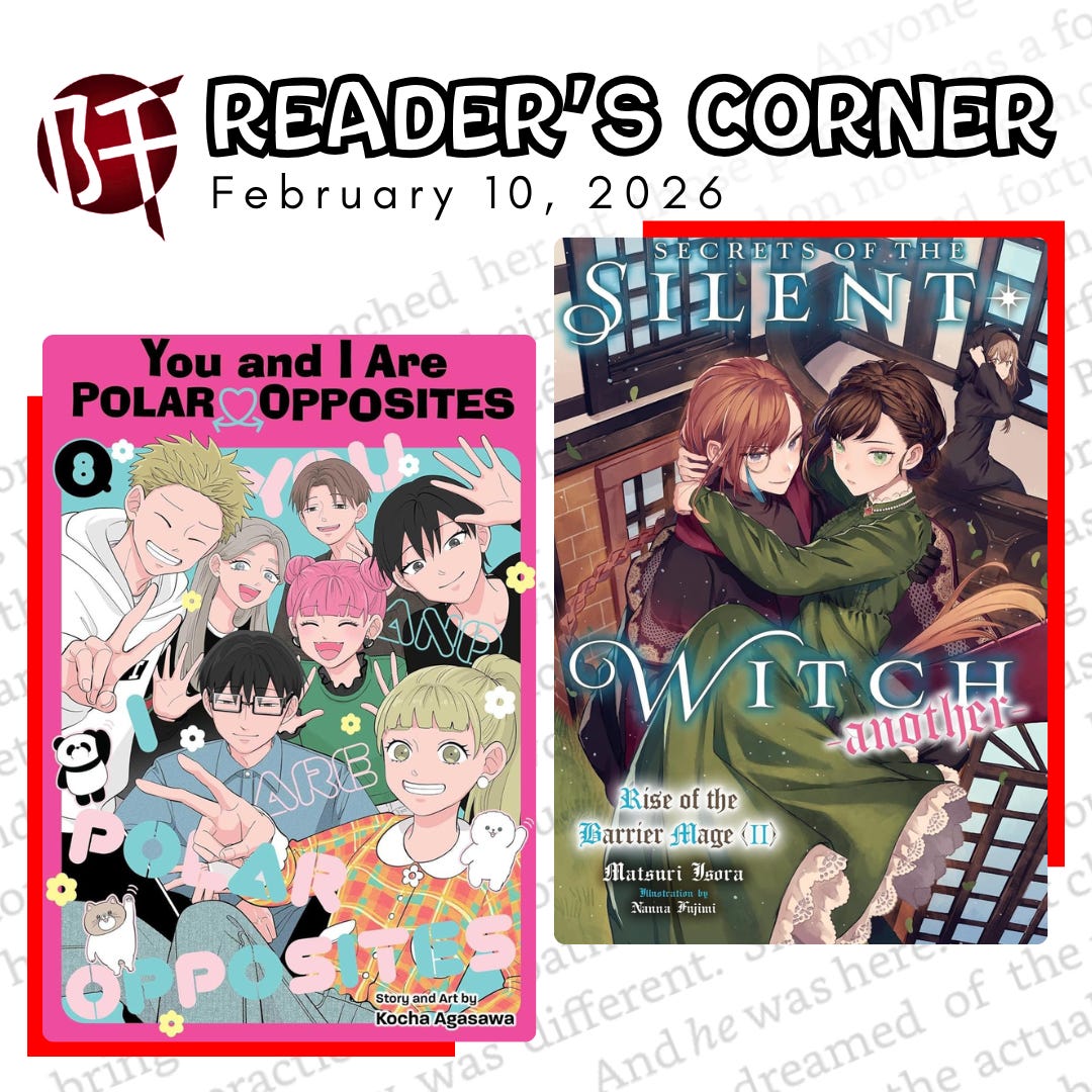 Just in time for Valentine’s Day, we have a slew of romantic manga and light novels to share with you on Reader’s Corner, from a burgeoning love triangle in the latest volume of Dandadan to a new harem series about a reborn adventurer, and from the Barrier Mage’s quest to marry his beloved to the final volume of Your And I Are Polar Opposites!