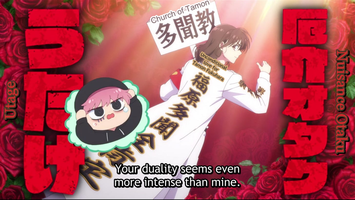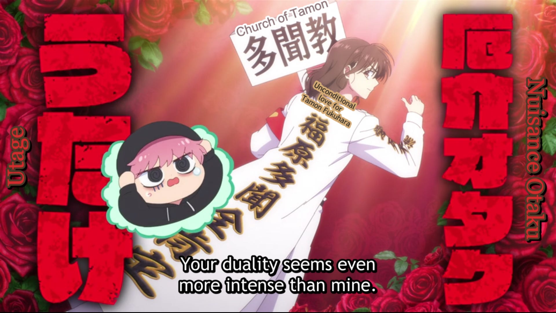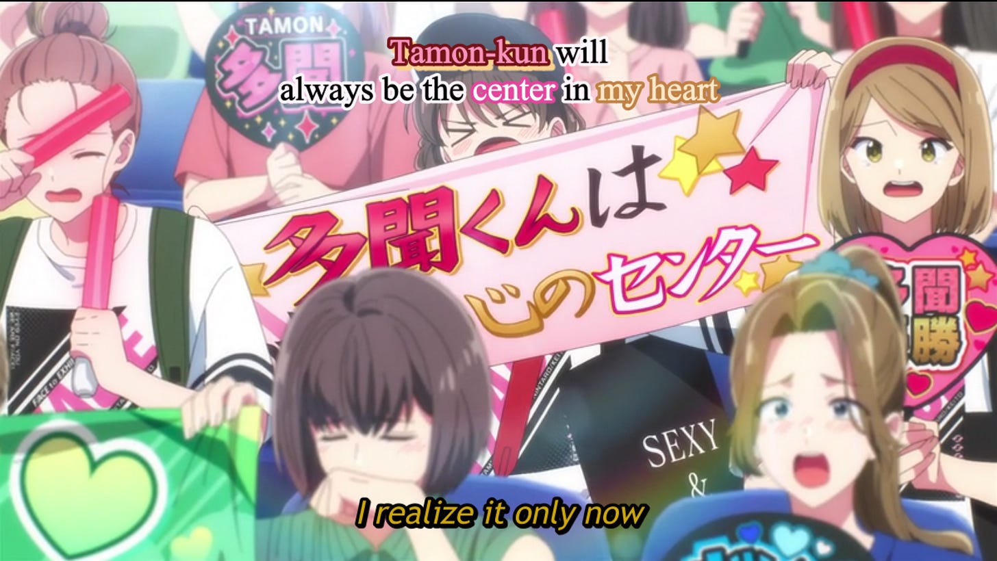 Yet, it is not Kinoshita’s “church” that inspired me to write this devotional—it is her worship. She is a passionate defender of Tamon, even reminding his self-abasing “B-side” that degrading himself does not accomplish his goal of making everyone happy. In some humorous moments, she holds a sign that says “Church of Tamon” and lectures him about the importance of treating both his fans and himself well. She believes in Tamon so much that she supports him through the various trials he experiences, and Tamon comes to realize he needs Kinoshita to help him continue to be the Tamon everyone admires.