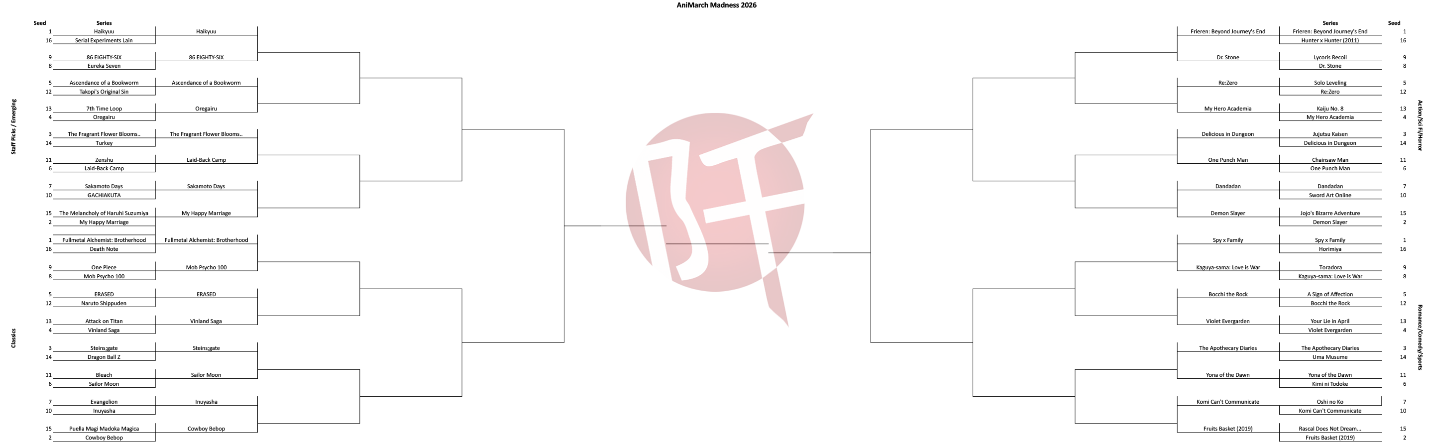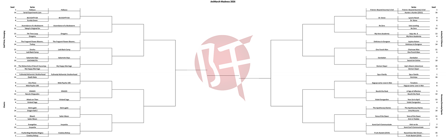 AniMarch Madness is fully underway, and round one is complete! Here’s the updated bracket—you, our dear readers, get to see it before anyone else!