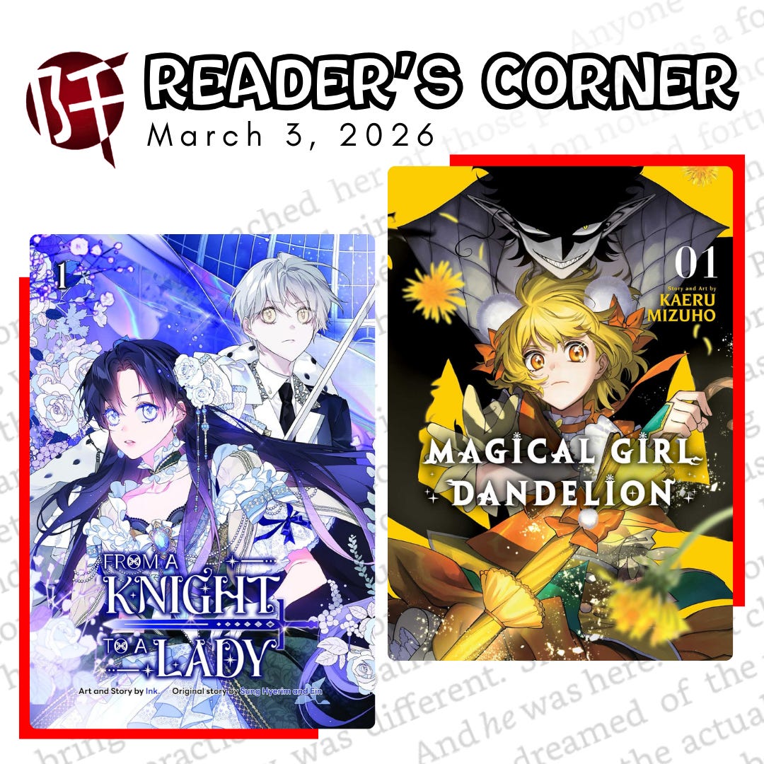 In the Reader’s Corner this week, Twwk reviews a range of stories, including the mysterious Magical Girl Dandelion Volume 1, the humorous The Way of the Househusband Volume 15, the warmhearted romance of Insomniacs After School Volume 13, and a manhwa with potential in From a Knight to a Lady Volume 1. Other reviews include two by WacOtaku, who explores more psychological and political manga in Tower Dungeon Volume 4 and Steel of Celestial Shadows Volume 9.